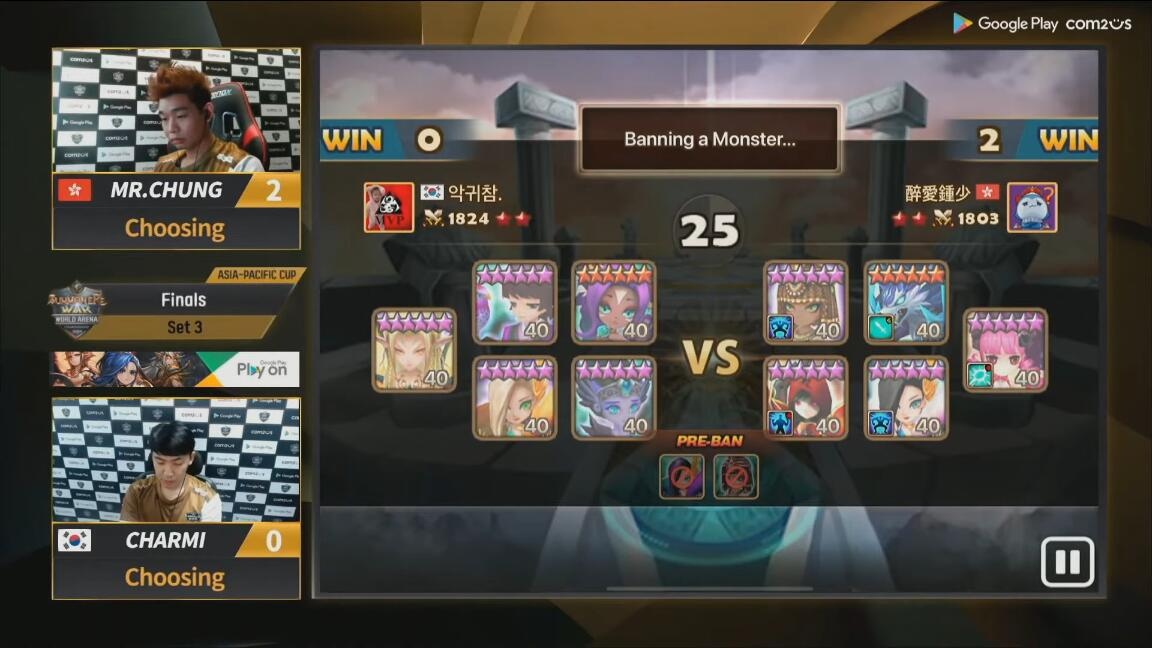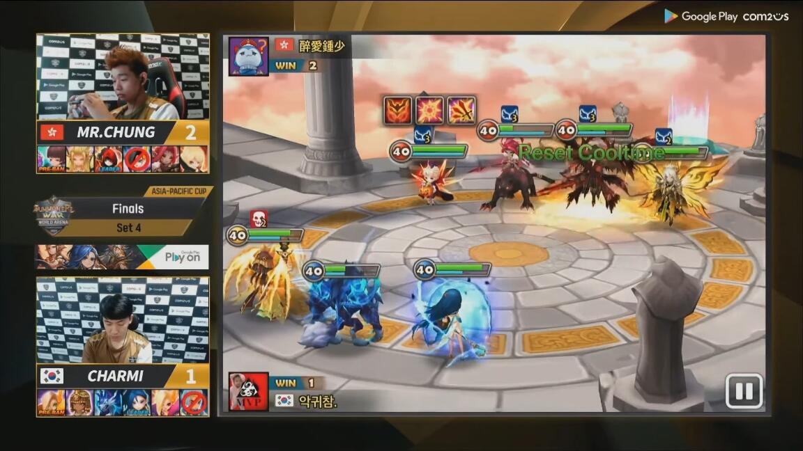 「醉愛鍾少(MR.CHUNG)」選手於冠軍賽中對上韓國選手「CHARMI」,以勢如破竹的氣勢率先取得 2 連勝到了賽末點,但「CHARMI」於第 3 戰立刻拿出他的招牌角色「暗仙人」以及「暗功夫貓」成功壓制「醉愛鍾少(MR.CHUNG)」的氣勢,而「醉愛鍾少(MR.CHUNG)」在第4戰也立即調整陣容,以「火吸血鬼」、「火方舟天使」以及「風精靈王」的高連動性搭配,有如銅牆鐵壁般守住對手的攻勢,並以滴水穿石的攻擊,順利取得最終勝利,拿下冠軍!