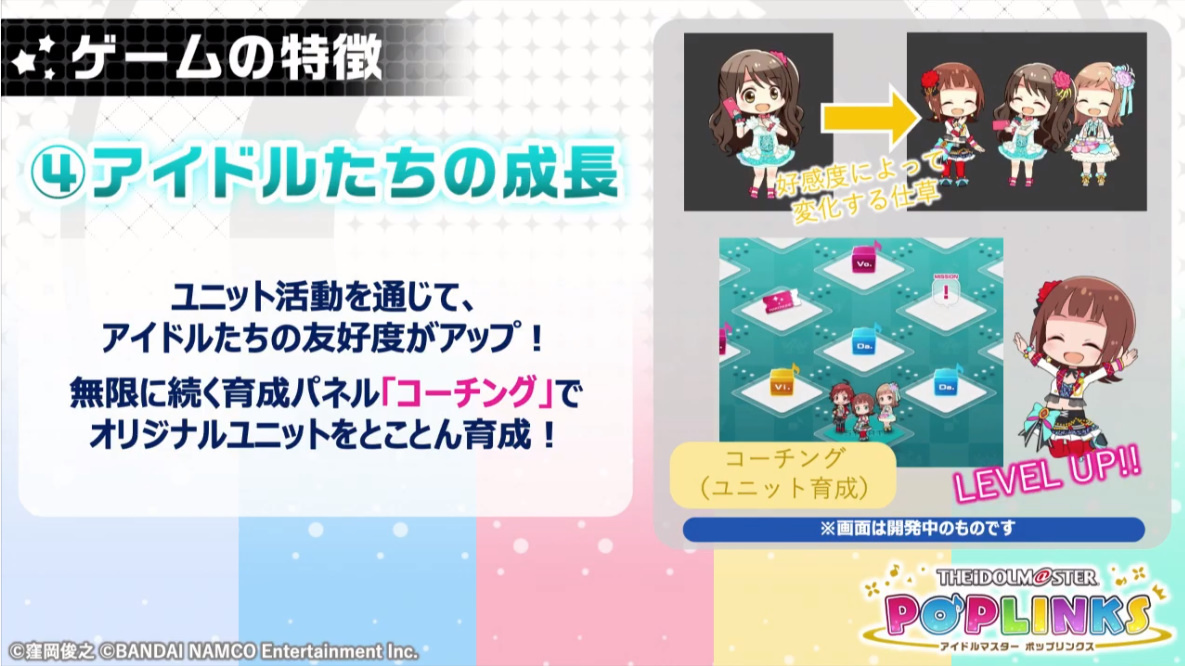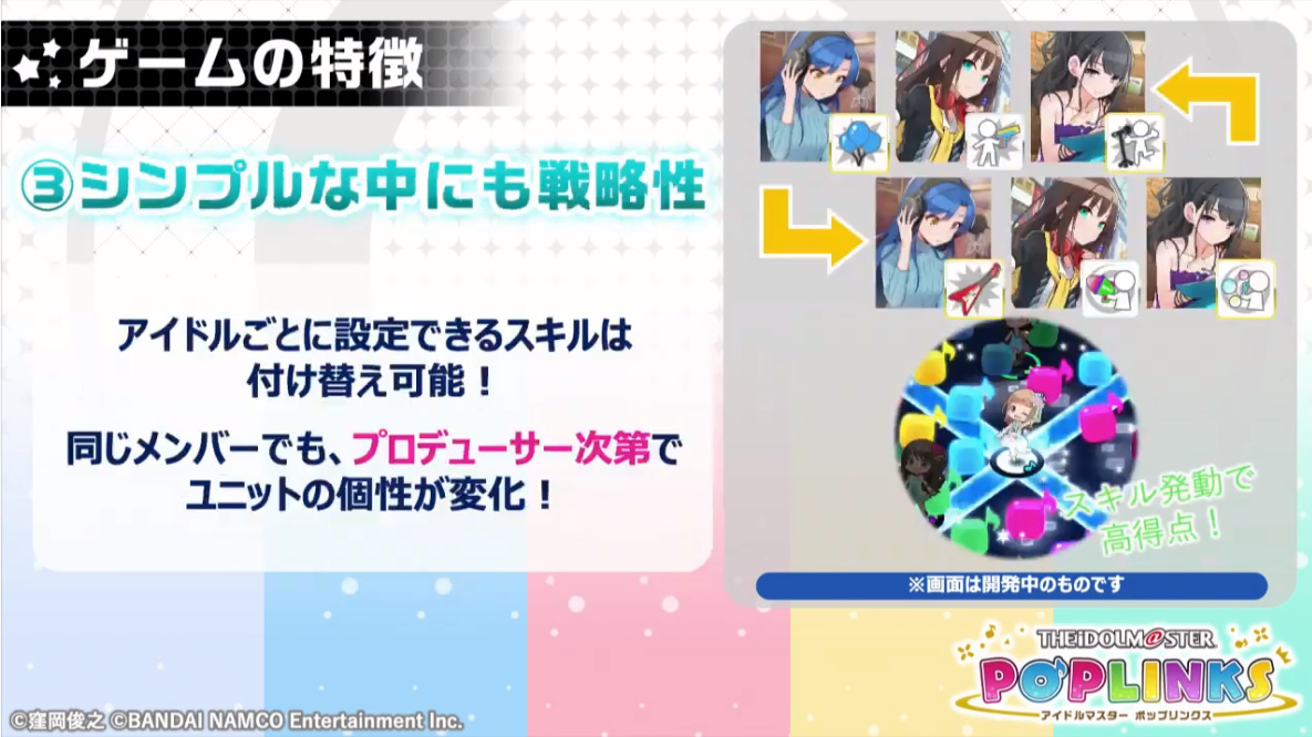 《Poplinks》為一款讓玩家們可以跨越《偶像大師》系列事務所限制,讓玩家們從自己喜歡的偶像中挑選出三名角色來組成團隊,將系列玩家們熟悉的偶像角色養成與 Live 益智演出相結合的休閒新作。在遊戲中,玩家們可以來選擇自己喜歡的角色進行組隊培育,透過各種劇情加深與他們之間的羈絆關係,並自訂他們的外觀特徵,與他們一起挑戰各種 Live 益智關卡高分目標,體驗不一樣的《偶像大師》全新手機遊戲樂趣。