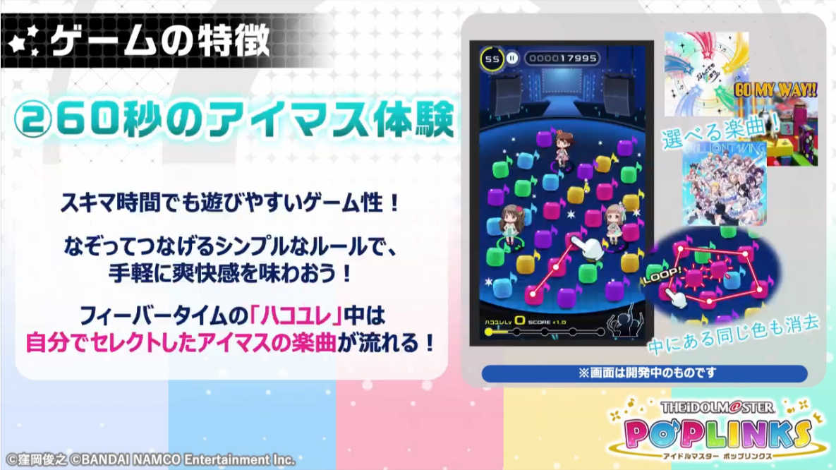 而在遊戲中,除了將會配合手機玩家操作習慣,收錄各式各樣能夠在 60 秒時間內快速挑戰,規則簡單的益智關卡登場外,也將提供讓玩家們在關卡中選擇自己喜歡的《偶像大師》樂曲作為闖關時的背景音樂讓玩家們欣賞同樂;同時玩家們還可以針對每個偶像設定各自不同的技能,讓偶像個性更具變化性,也為玩家們在闖關時增添更多助力。