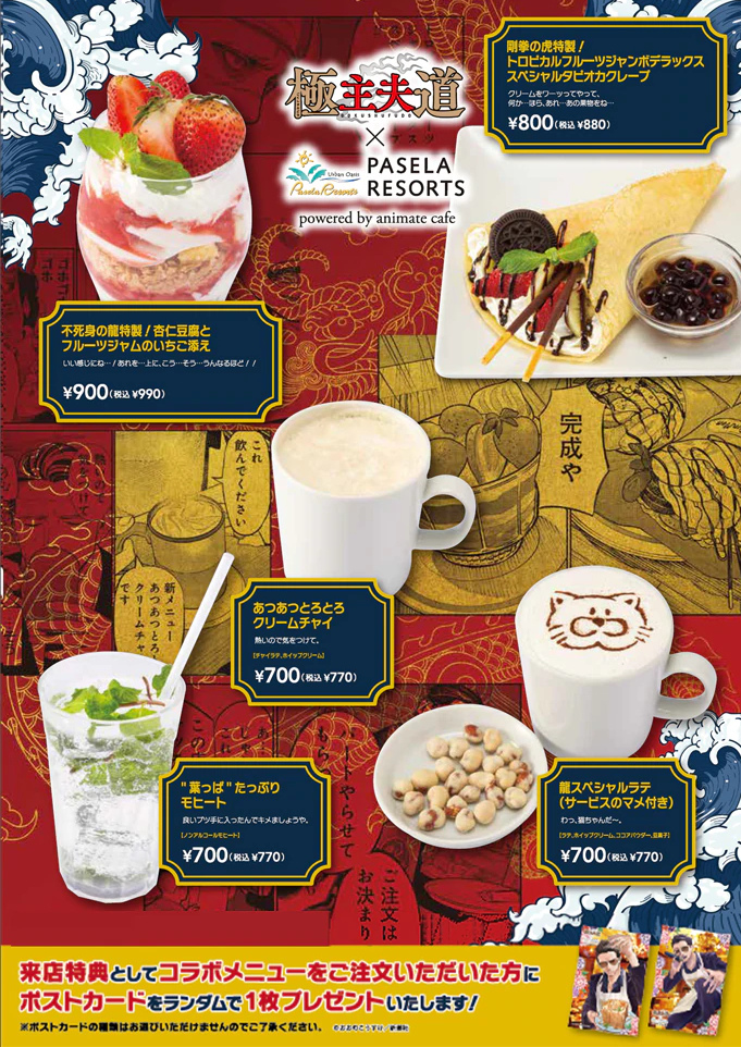 菜單中「任俠蛋包飯」、「蜂蜜檸檬三明治」、「龍的漢堡排套餐」、「熱呼呼濃郁厚奶茶」等都是重現漫畫上出現過的料理。只要點購一份餐點就可以獲得特製杯墊,另外點購聯名菜單都可獲得特製明信片。