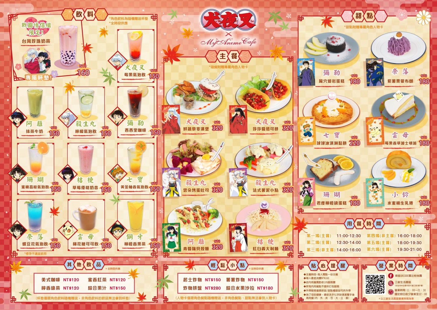 MyAnime Café 為這次的《犬夜叉》主題餐廳準備了 11 款飲品、6 款主餐、6 款甜點,點購飲品即可獲得杯墊,點購餐點即可獲得收藏卡,點購「戰國情侶組」台灣珍珠奶茶才能收集到阿籬&犬夜叉的特殊款雙人杯墊!在這個空間中與三五好友聚會,還有享受和角色們一同用餐的氣氛也是難得的體驗,希望大家都能吃得健康、玩得開心。