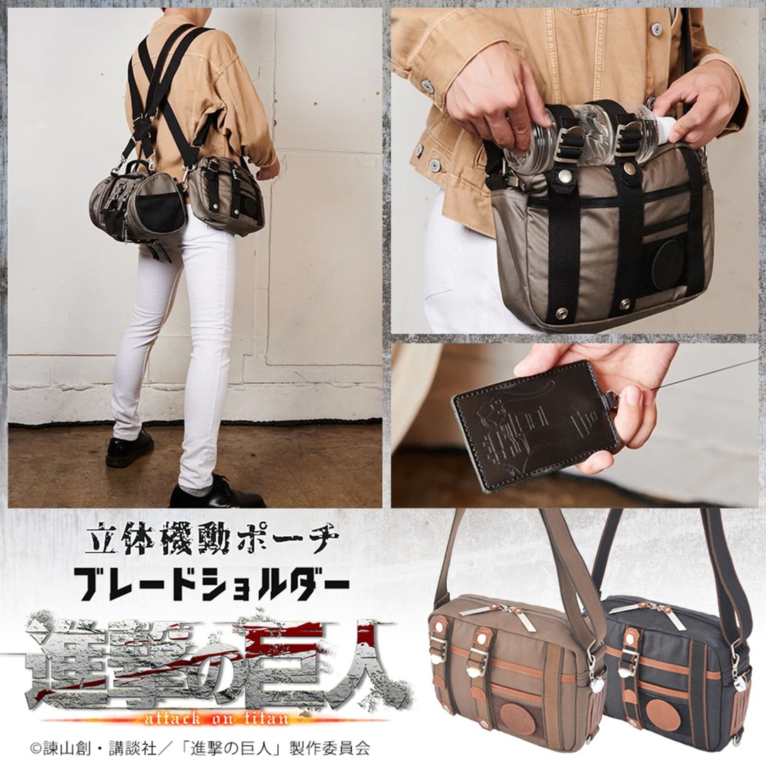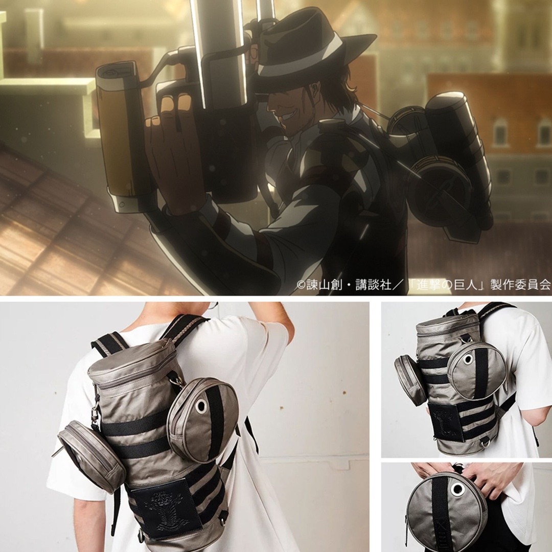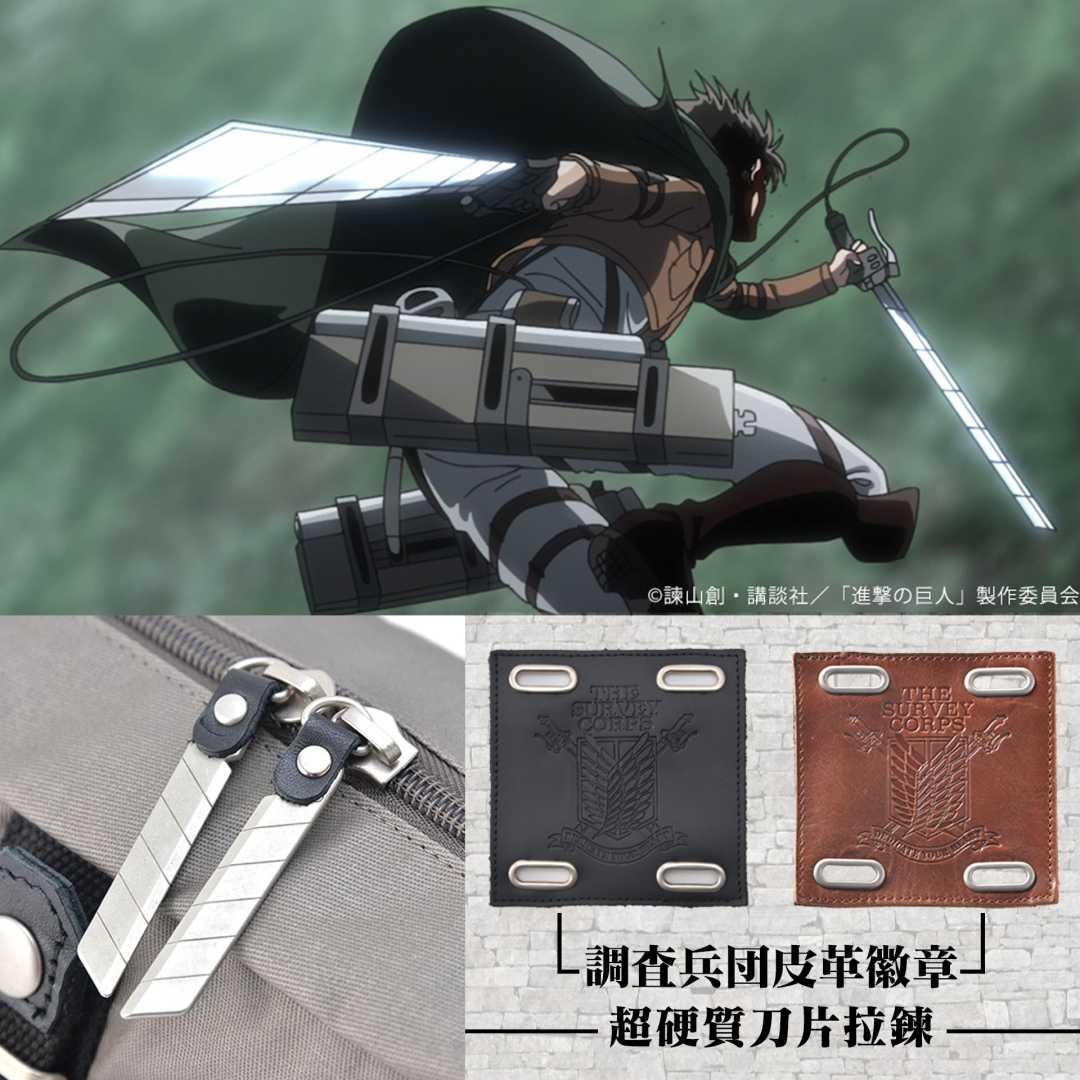 調查兵團能夠在建築間、森林裡、巨人群中穿梭自如,全歸功於「立體機動裝置」的強大設計,這四種包款即是以此為設計概念開發,不管是「立體機動裝置」還是「對人立體機動裝置」,都能成為你的隨身配備。每個包款拉鍊頭都是「超硬質刀片」外型,前方還附有可拆式的「調查兵團徽章」,讓你一圓成為調查兵團的夢想。