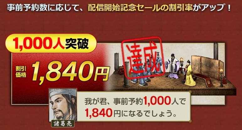 另外隨著目前 App Store/Google Play 雙平台與官網預約人數突破 1,000 人,官方宣布本作將自發售日 12 月 16 日起,至 12 月 28 日為止推出優惠價 1,840 日圓的 68 折優惠折扣讓玩家們入手;同時為了慶祝本作上市,也將會與目前推出中的手機版《三國志 霸道》、單機版《三國志14 威力加強版》推出聯名活動,至於細節將於日後另行發表。